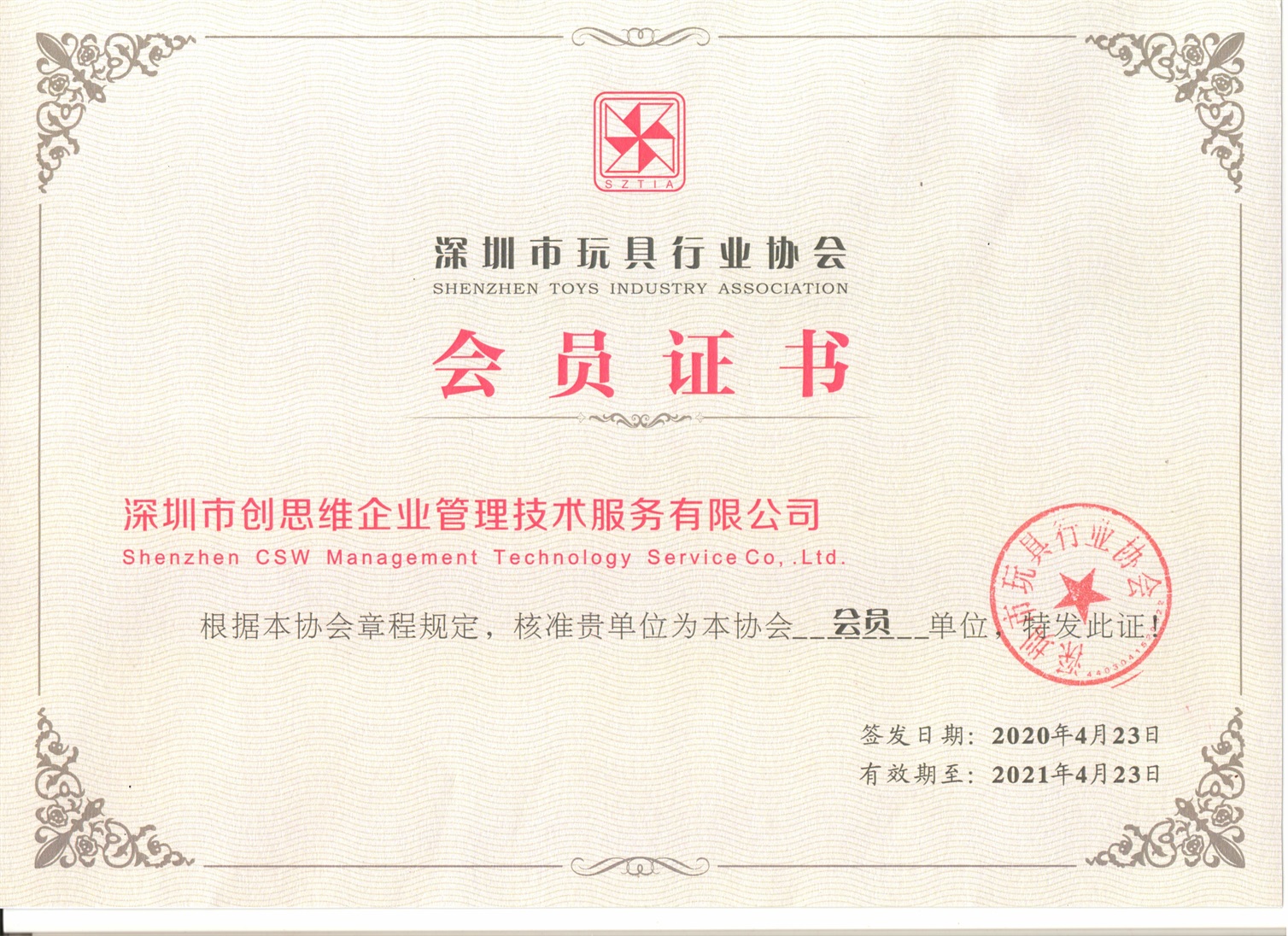 玩具行業(yè)協(xié)會(huì)會(huì)員證書