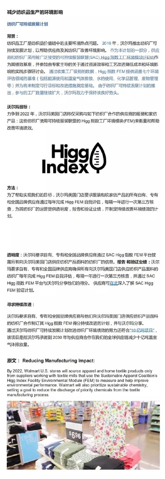 · 沃爾瑪要求其供應美國沃爾瑪門店的自有/專有/全國品牌的服裝供應商/軟家紡產品供應商/供應紡織產品面料的紡織廠在2022年之前, 每年完成一次Higg FEM的自評;
